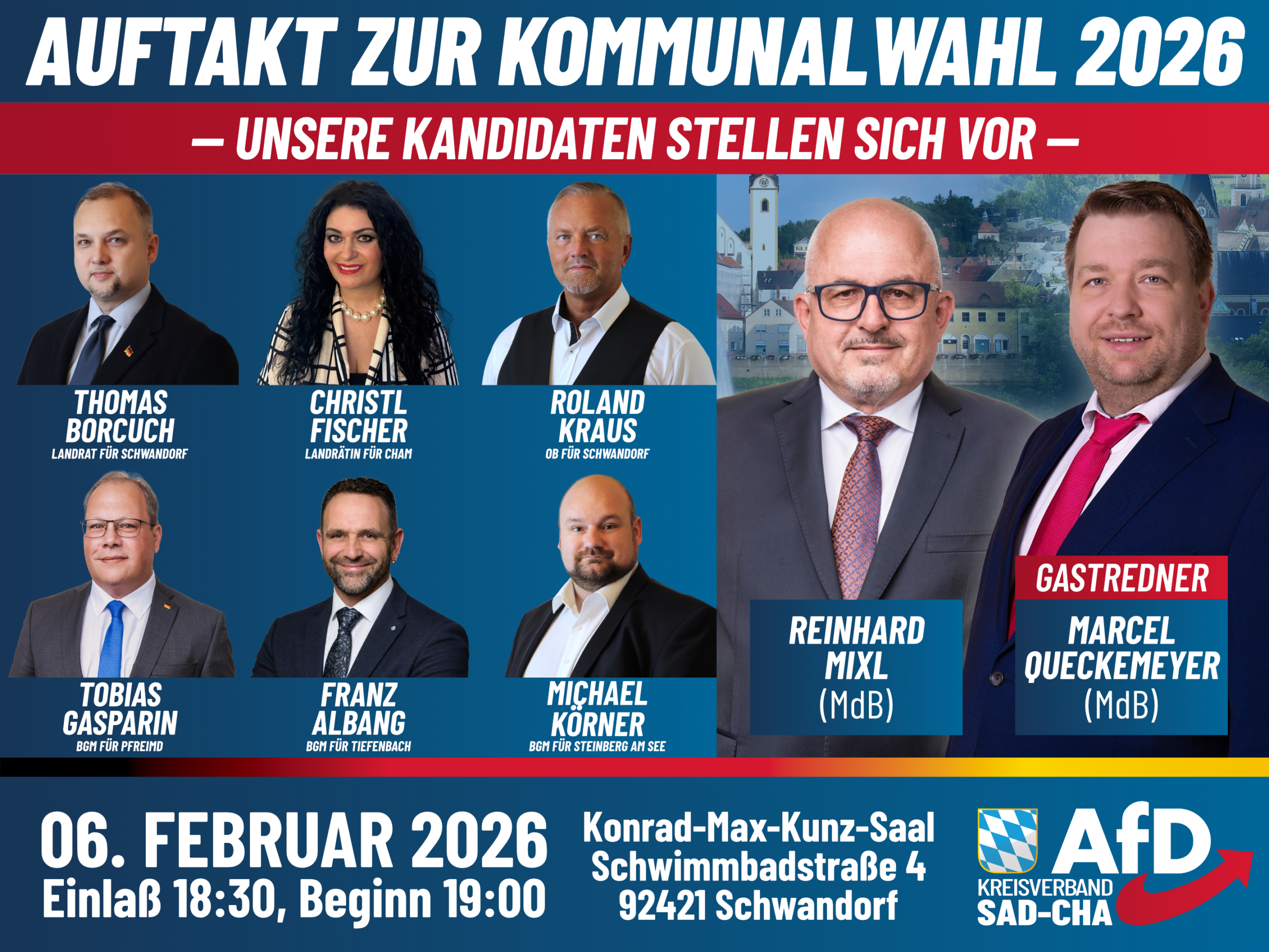 Am Freitag, den 6. Februar 2026, laden wir zum offiziellen AfD-Wahlkampfauftakt der AfD Schwandorf/Cham für die Kommunalwahl 2026 ein.