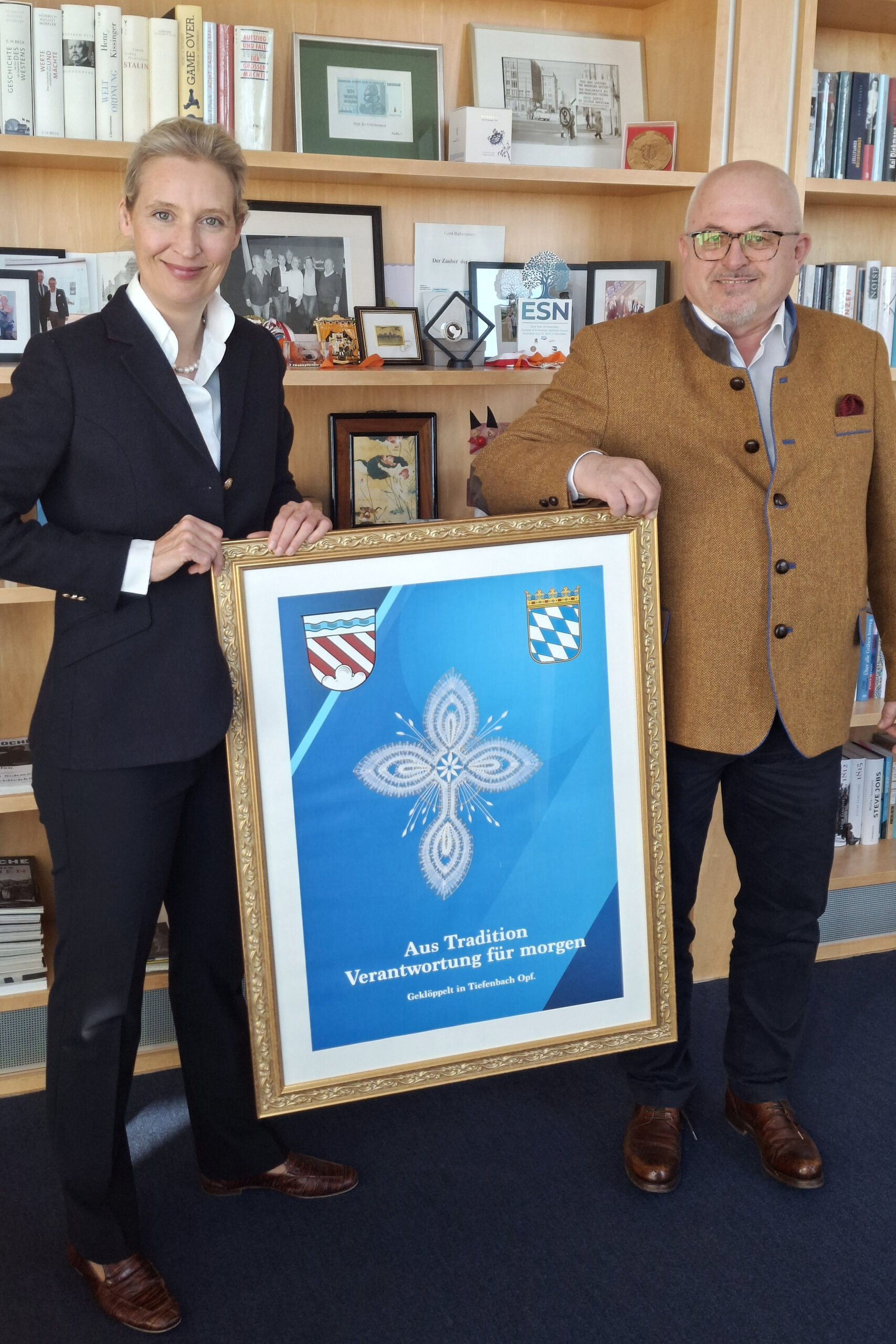 Ein besonderes Stück Handwerkskunst aus Tiefenbach wurde kürzlich übergeben: Der Bundestagsabgeordnete Reinhard Mixl überreichte Dr. Alice Weidel, MdB, ein gesegnetes Klöppelkreuz der Klöppelschule Tiefenbach.